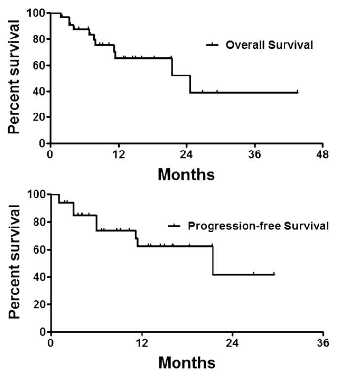 中位 PFS 为 21.4 个月,3、6 和 12 个月 PFS 率分别为 84.7%、73.7% 和 62.3%。中位 OS 为 24.6 个月,3、6 和 12 个月 OS 率分别为 93.9%、87.6% 和 65.2%。