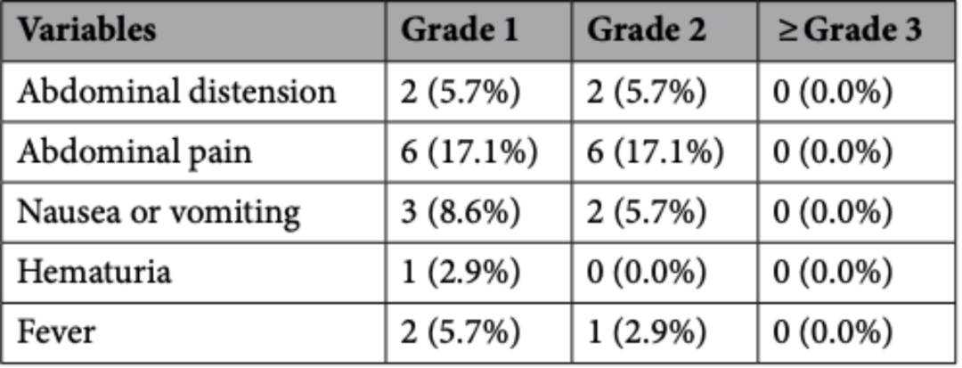 未观察到严重不良事件,包括围手术期死亡或 3 级或以上的治疗相关不良事件。腹痛和腹胀分别为 12 例和 4 例。5 名患者(14.3%)出现恶心或呕吐,并在 2-3 天内得到控制。1例患者DEB-TACE后出现1级血尿,经止血成功治疗。