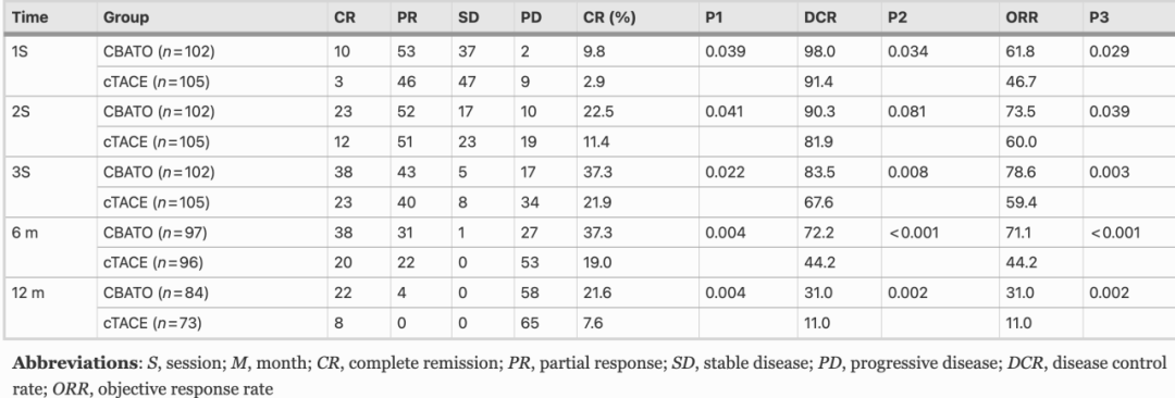 12个月时,CBATO组和cTACE组ORR分别为31.0%、11.0%(p=0.002);DCR为31.0%、11.0%(p=0.002)。